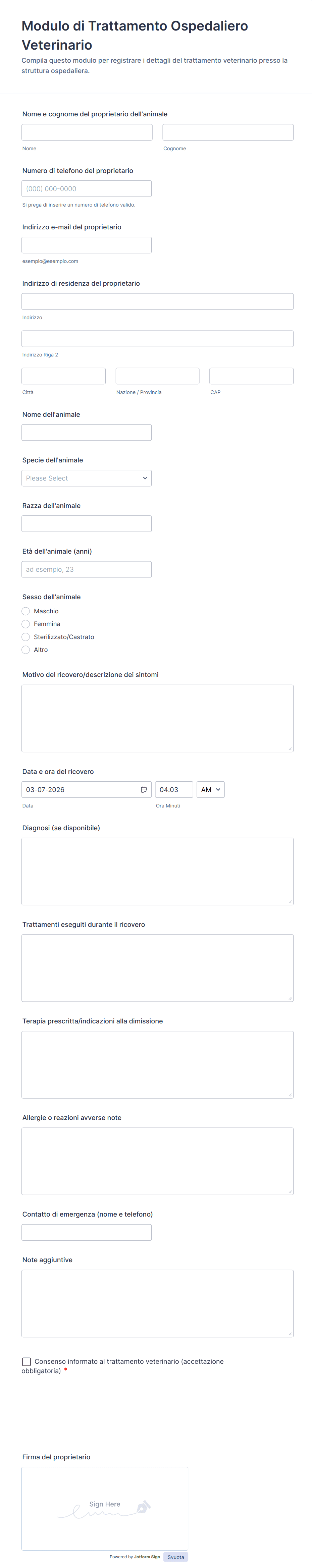Dovrebbe includere i dati di contatto del proprietario, le informazioni essenziali dell’animale e una sezione per descrivere il motivo del ricovero e i trattamenti, insieme all’accettazione del consenso informato e alla firma del proprietario.