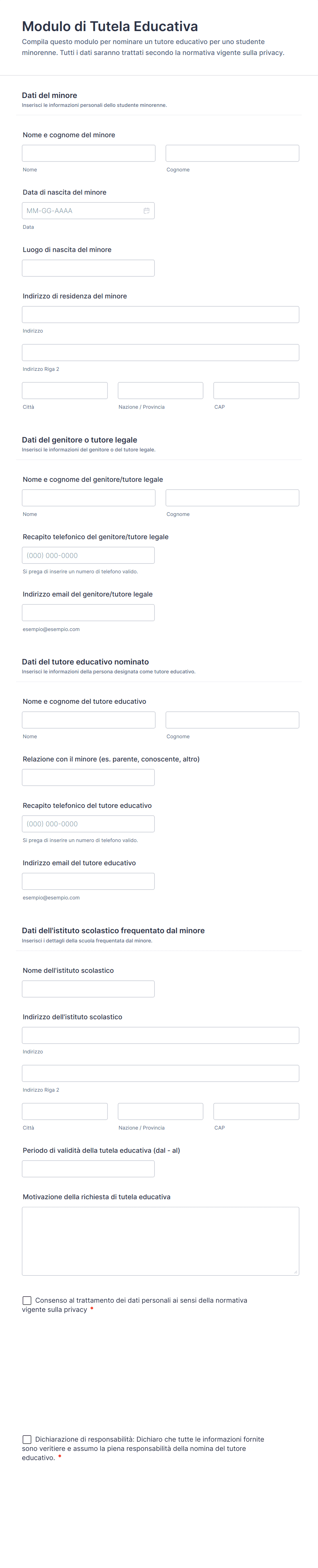 Raccogli richieste di nomina di un tutore educativo per minori con il Modulo di Tutela Educativa di Jotform, ideale per scuole, famiglie e servizi educativi che gestiscono deleghe e comunicazioni in modo ordinato.
