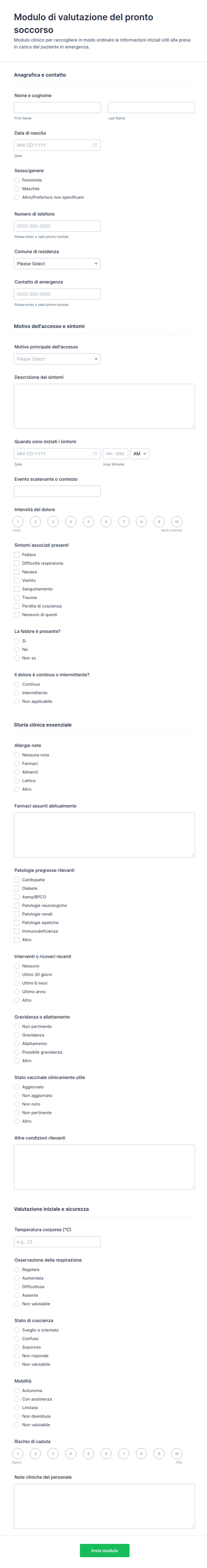 Esistono molti tipi diversi di moduli per il settore sanitario che coprono qualsiasi esigenza, dall'assicurazione all'anamnesi, alla dimissione. I principali tipi di moduli sanitari sono moduli di telemedicina, moduli di registrazione dei pazienti, moduli per farmacie, moduli per hospice, moduli di dimissione ospedaliera e indagini mediche. Possono coprire anche argomenti come il consenso informato, le prescrizioni, le richieste di indennizzo assicurativo e le segnalazioni.