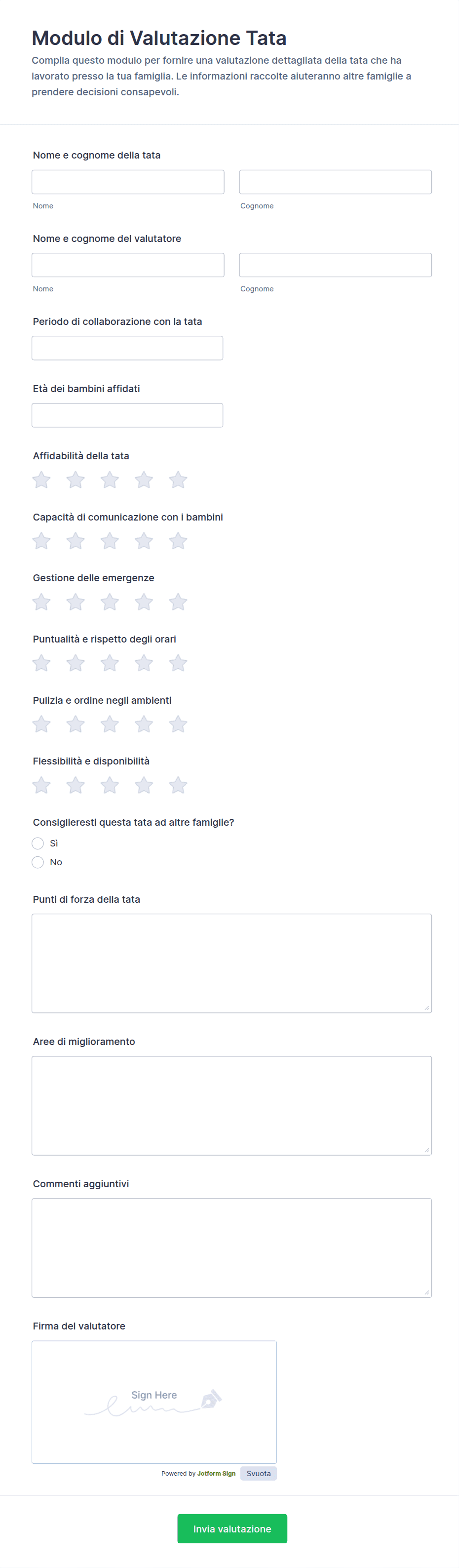 Raccogli valutazioni sulla tata da famiglie o agenzie, confronta feedback nel tempo e conserva uno storico chiaro con il Modulo di Valutazione Tata di Jotform per una data collection più ordinata.