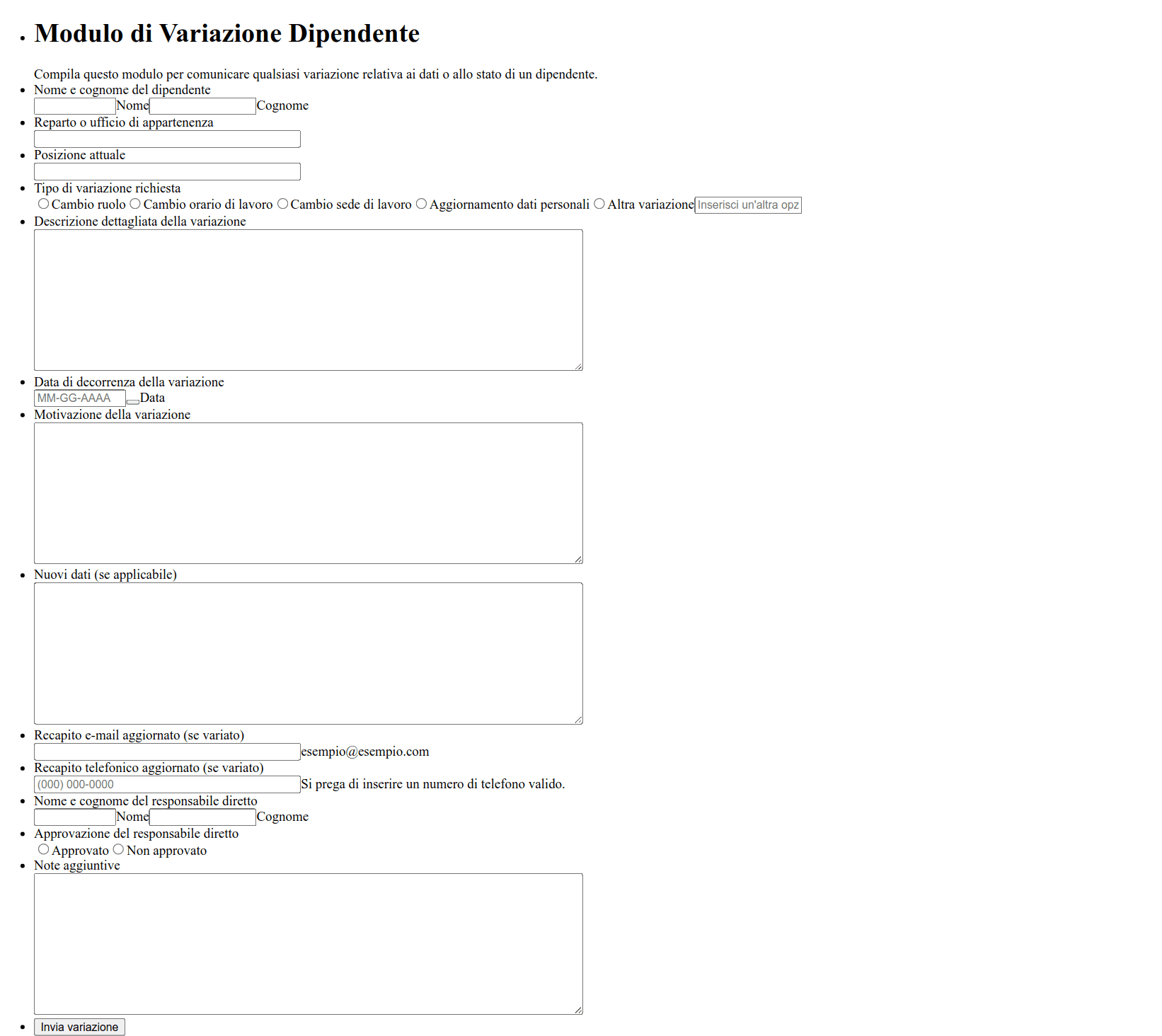 - Modifiche al libro paga: Potrebbero richiedere campi per la matricola del dipendente, il periodo di pagamento, il tipo di modifica e la documentazione di supporto.