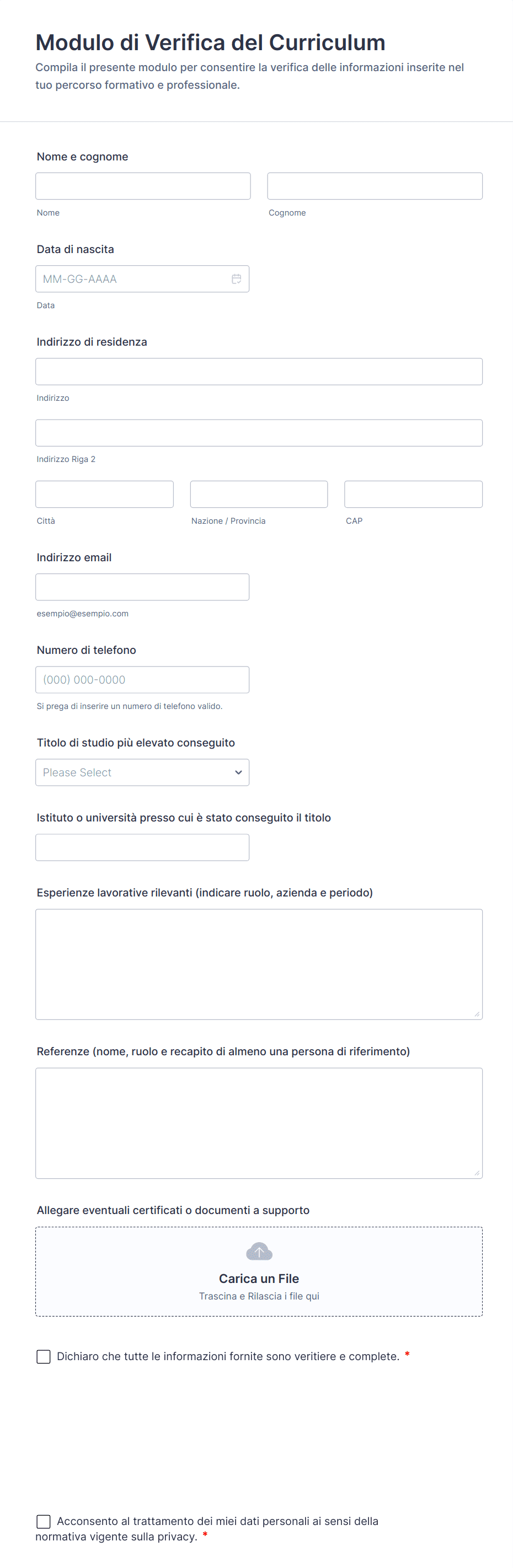 - Per la verifica, includi campi per il caricamento di documenti (es. carta d'identità, prova di residenza, certificati).