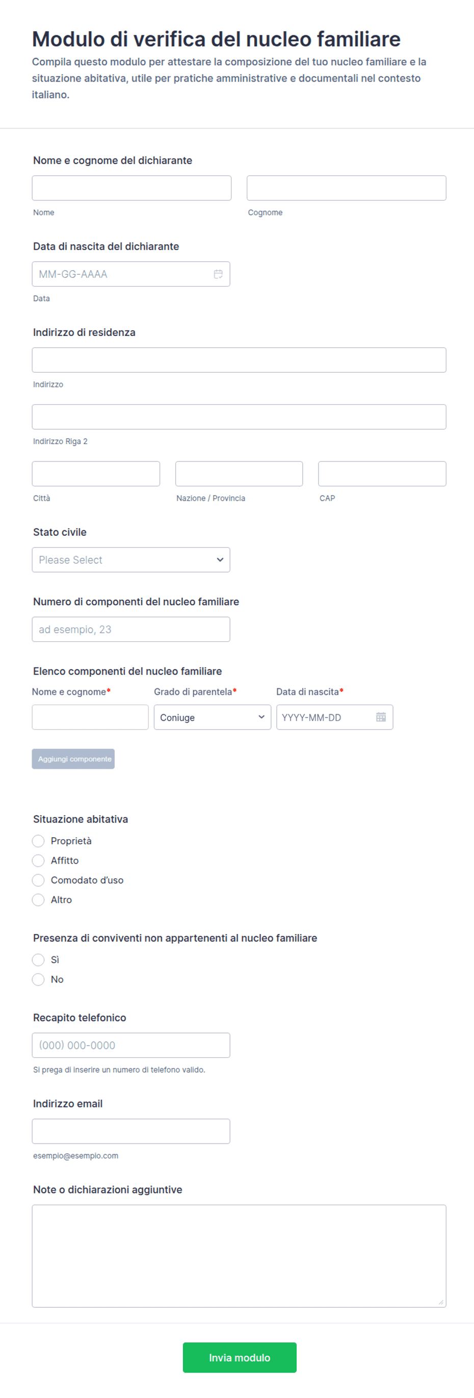Raccogli e verifica rapidamente le informazioni sul nucleo familiare per pratiche amministrative, iscrizioni e richieste di agevolazioni con il Modulo di verifica del nucleo familiare di Jotform, personalizzabile e condivisibile online.