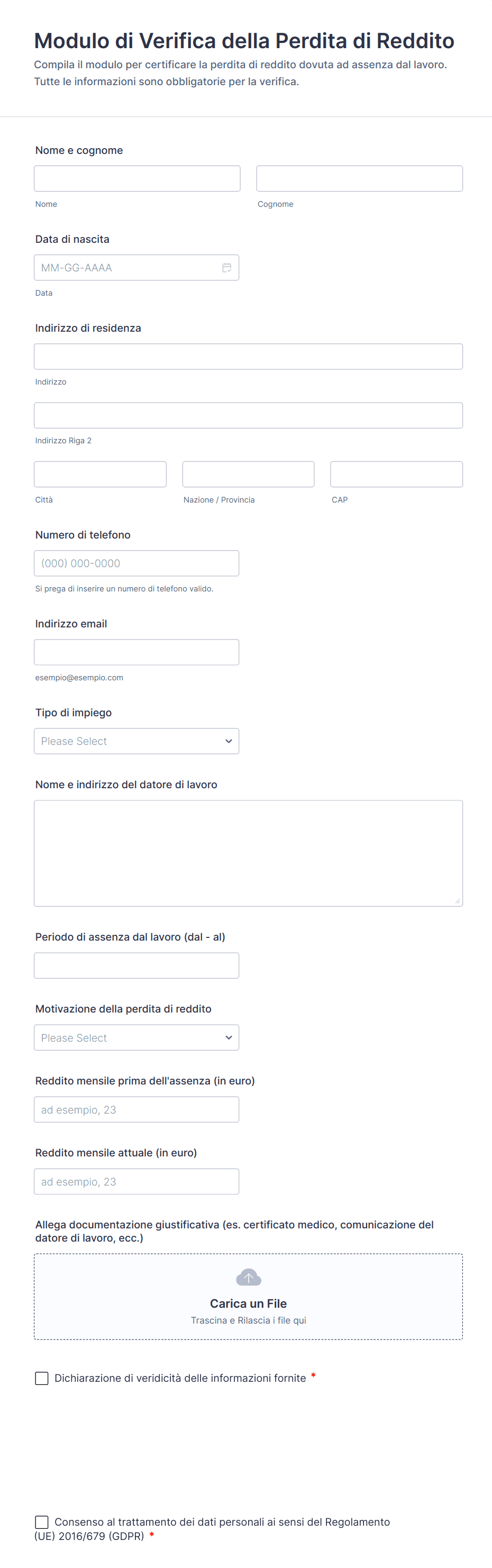 - Per la verifica, includi campi per il caricamento di documenti (es. carta d'identità, prova di residenza, certificati).