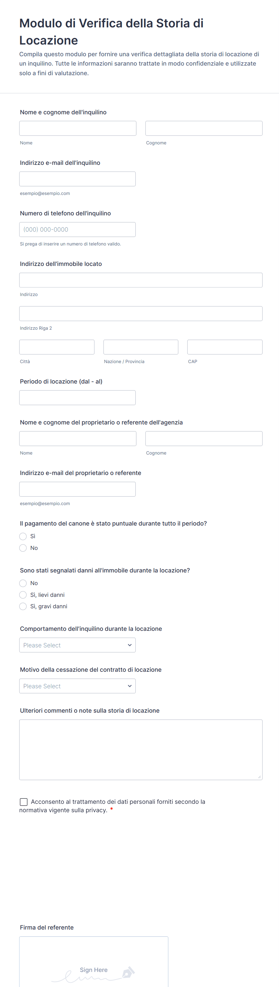 I moduli di verifica sono strumenti digitali specializzati progettati per autenticare, validare o confermare le informazioni fornite da individui o organizzazioni. Questi moduli vengono comunemente utilizzati per verificare identità, credenziali, status occupazionale, indirizzi o altri dati critici in modo sicuro ed efficiente. I casi d'uso tipici includono l'inserimento di nuovi dipendenti, la conferma dell'iscrizione degli studenti, la convalida delle identità di clienti per servizi finanziari, o l'assicurazione della precisione dei documenti inviati, nei processi di conformità. Snellendo il processo di verifica, questi moduli aiutano le organizzazioni a ridurre le frodi, mantenere la conformità normativa e costruire fiducia con i loro stakeholder.