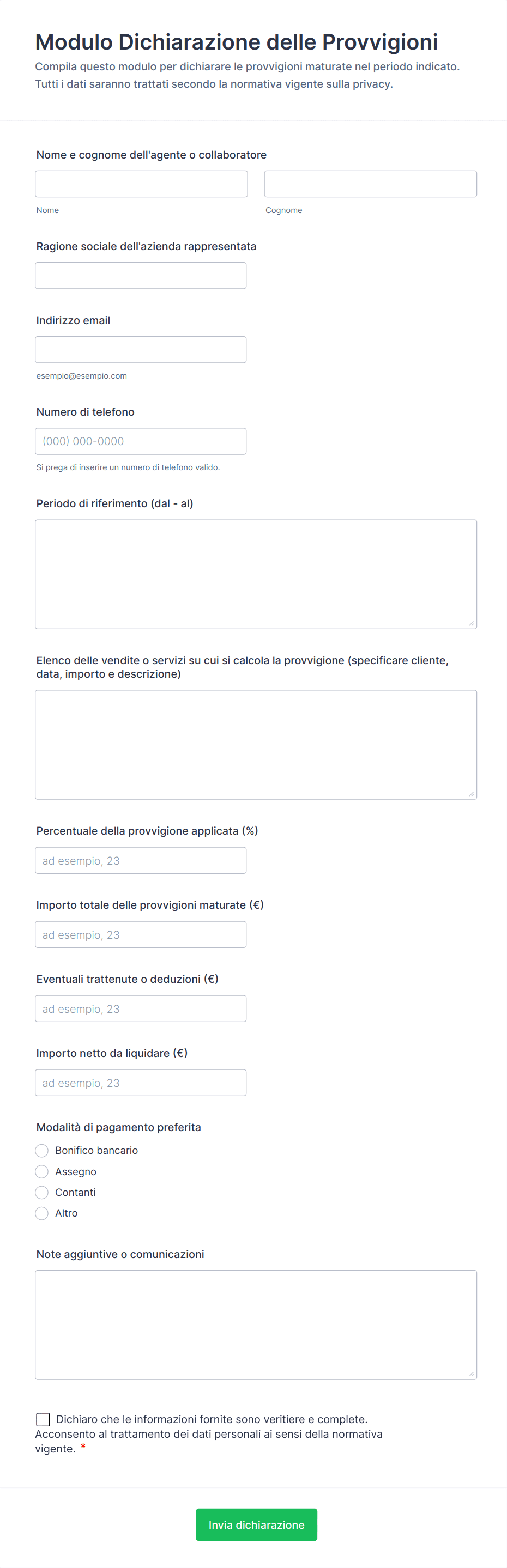Un modulo di dichiarazione è un documento utilizzato per raccogliere dichiarazioni ufficiali, conferme o divulgazioni da individui o organizzazioni, spesso per scopi legali, sanitari o di conformità.