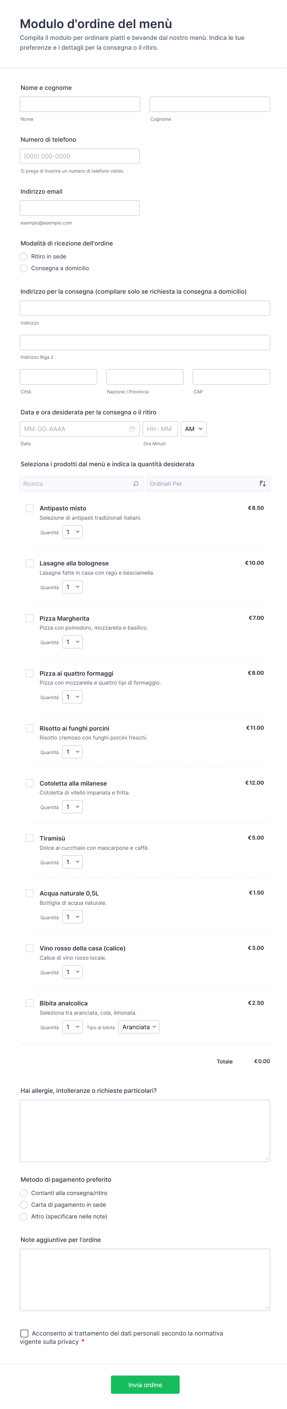 Campi comuni includono dettagli di contatto del cliente, selezioni di menu o prodotti, quantità, istruzioni speciali, preferenze di consegna o ritiro e informazioni di pagamento.