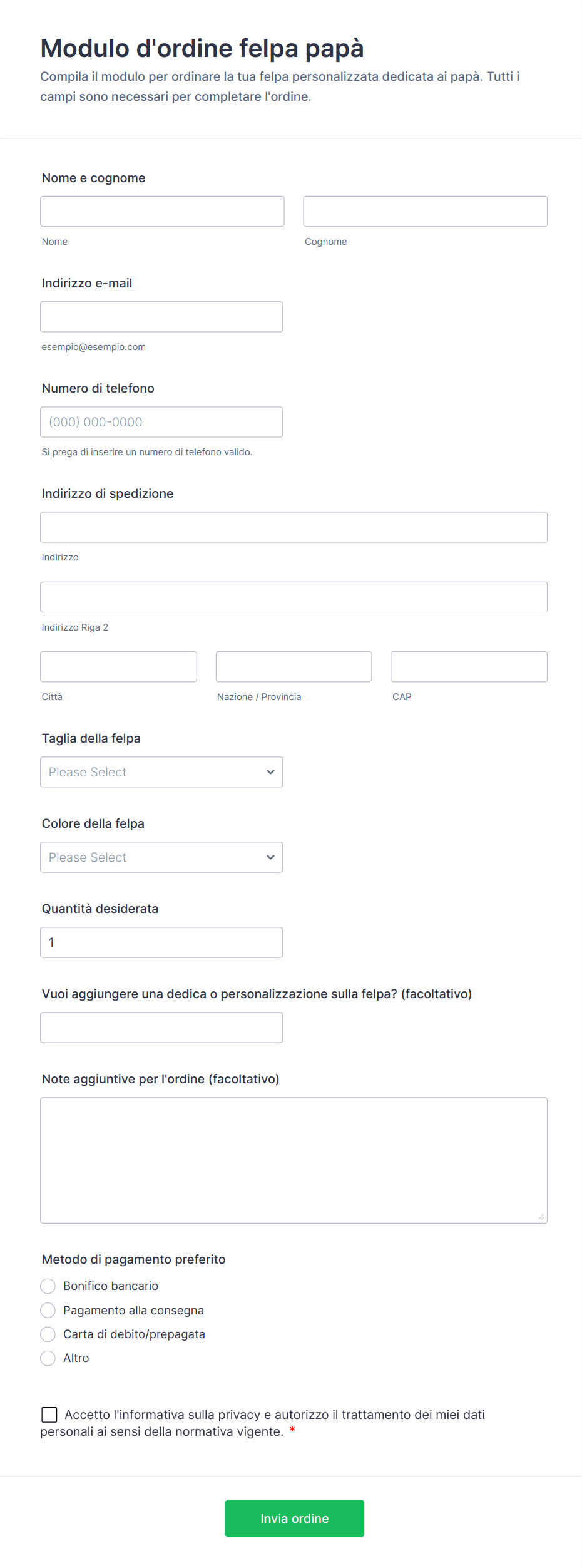 Campi tipici includono nome del cliente, dettagli di contatto, tipo di articolo, dimensione, colore, quantità, opzioni di personalizzazione e informazioni di pagamento.