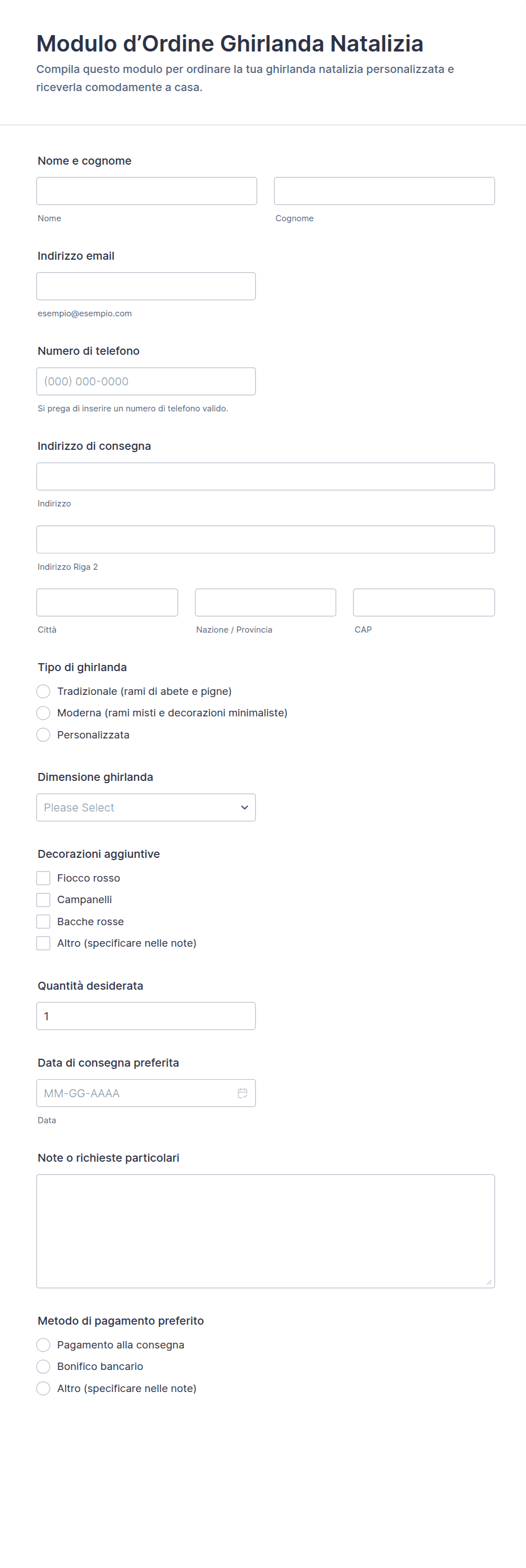 I campi tipici includono i dati di contatto del cliente, l'indirizzo di consegna, la data di consegna preferita, la selezione dei prodotti, la quantità, il metodo di pagamento ed eventuali istruzioni o messaggi speciali.