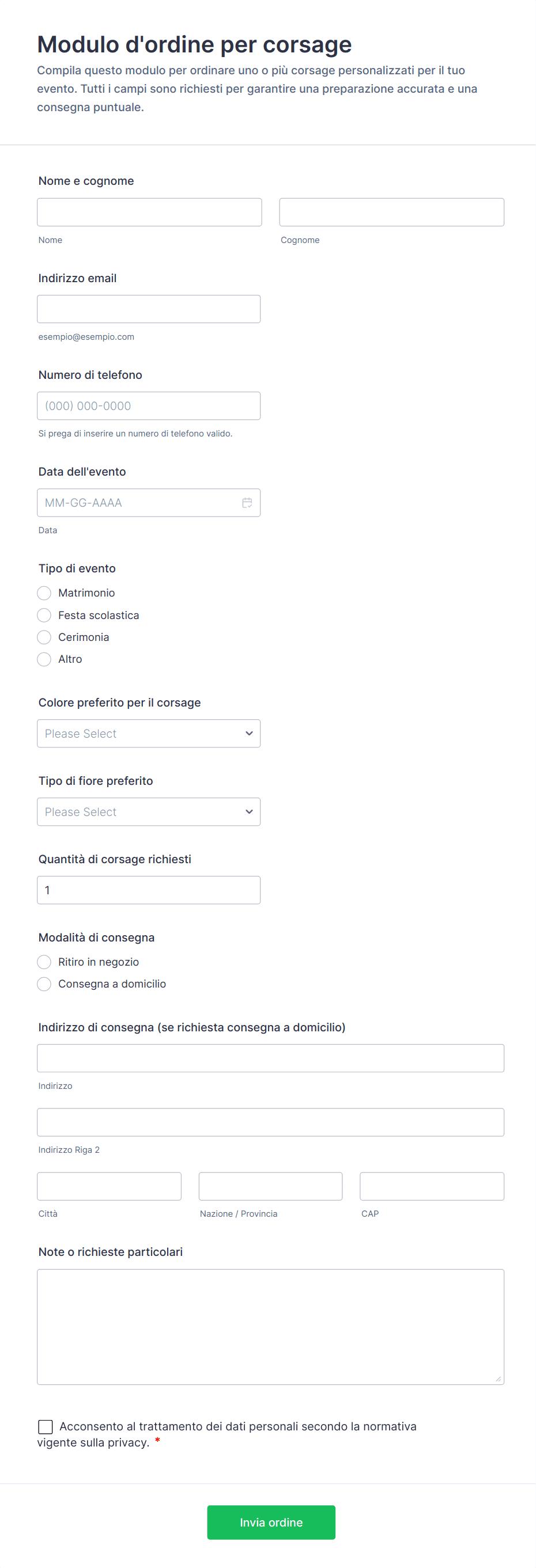 - Prenotazioni di eventi: Campi aggiuntivi per la data dell'evento, il luogo, i temi floreali e le istruzioni per l'allestimento.
