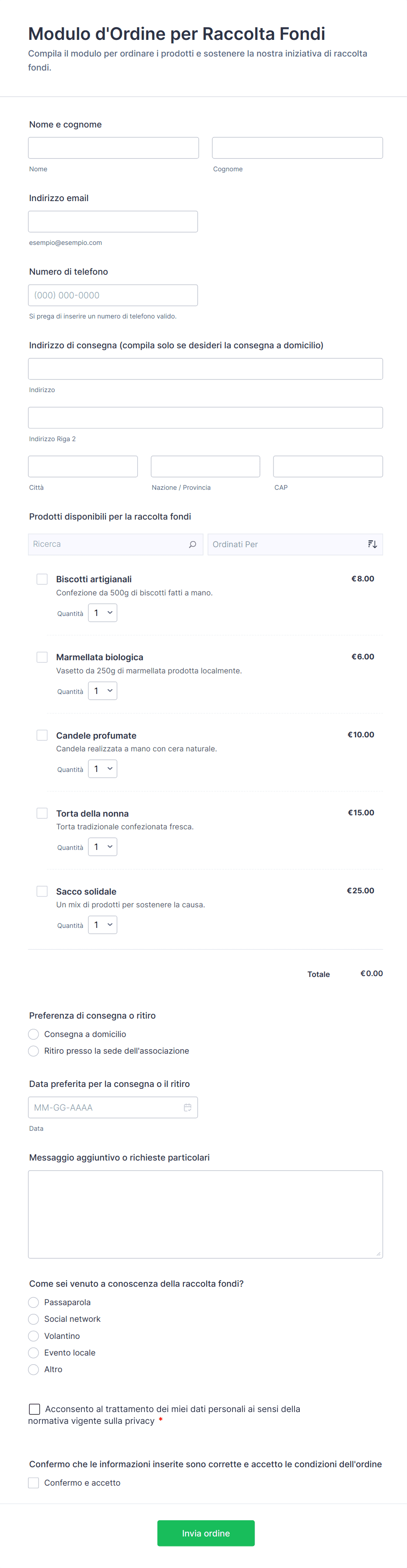 Raccogli ordini per campagne solidali con il Modulo d’ordine per raccolta fondi, utile per scuole, associazioni e gruppi sportivi che vogliono gestire raccolta dati e invio del modulo online in modo chiaro.