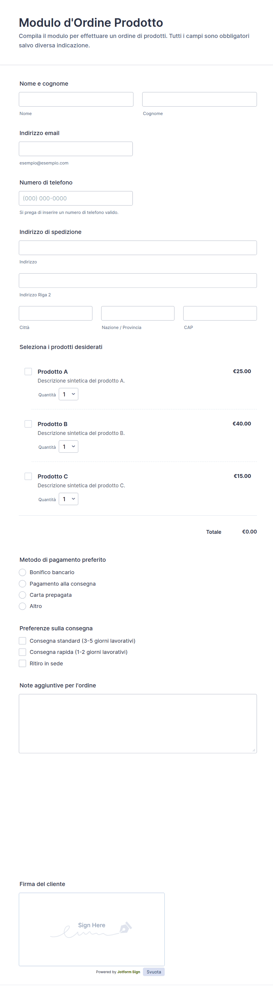 I moduli per ordini di prodotti sono strumenti essenziali per aziende e organizzazioni che necessitano di raccogliere ordini di prodotti fisici o digitali online. Questi moduli semplificano il processo di raccolta delle informazioni sui clienti, la selezione dei prodotti, le quantità, i dettagli di pagamento e gli indirizzi di spedizione, semplificando la gestione delle vendite e dell'inventario. I moduli per ordini di prodotti possono essere utilizzati in una varietà di scenari differenti, come siti di e-commerce, piccole imprese che vendono prodotti artigianali, ristoranti che consentono ordini online, vendita di merchandising per eventi o persino organizzazioni no-profit che raccolgono ordini per le raccolte fondi. La loro flessibilità consente di personalizzarli per checkout di singoli prodotti, cataloghi multi-articolo, preordini o offerte in abbonamento.