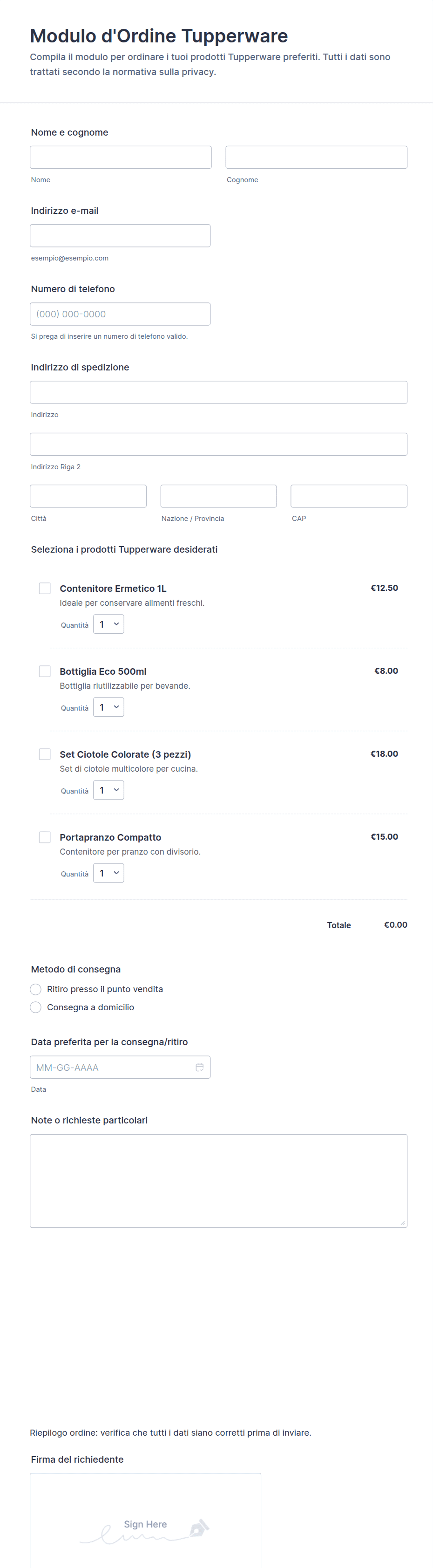I moduli per ordini di prodotti sono strumenti essenziali per aziende e organizzazioni che necessitano di raccogliere ordini di prodotti fisici o digitali online. Questi moduli semplificano il processo di raccolta delle informazioni sui clienti, la selezione dei prodotti, le quantità, i dettagli di pagamento e gli indirizzi di spedizione, semplificando la gestione delle vendite e dell'inventario. I moduli per ordini di prodotti possono essere utilizzati in una varietà di scenari differenti, come siti di e-commerce, piccole imprese che vendono prodotti artigianali, ristoranti che consentono ordini online, vendita di merchandising per eventi o persino organizzazioni no-profit che raccolgono ordini per le raccolte fondi. La loro flessibilità consente di personalizzarli per checkout di singoli prodotti, cataloghi multi-articolo, preordini o offerte in abbonamento.