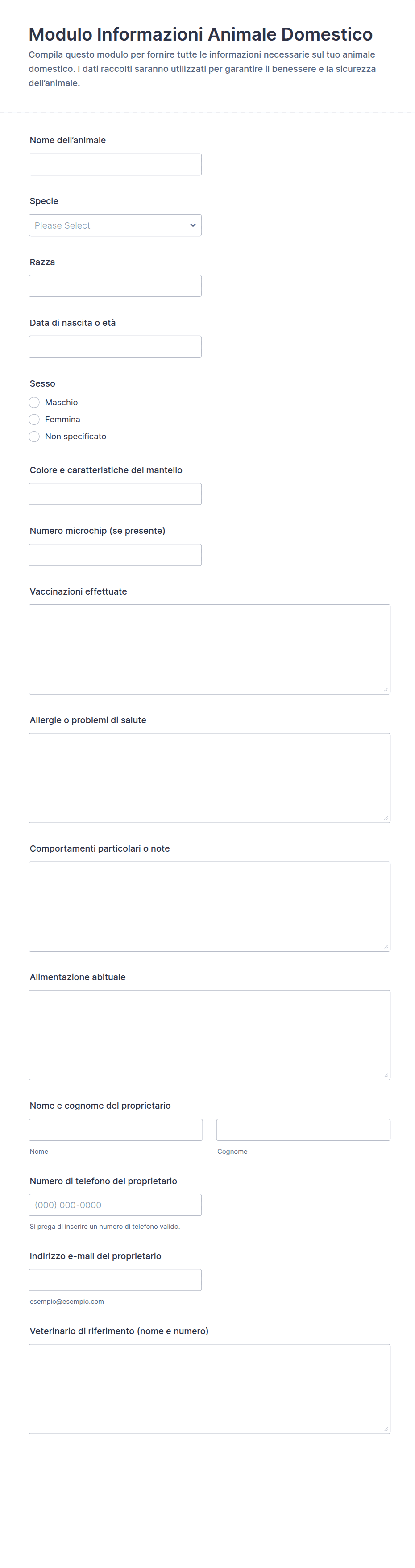 2) Cosa dovrebbe essere incluso nel Modulo Informazioni Animale Domestico?