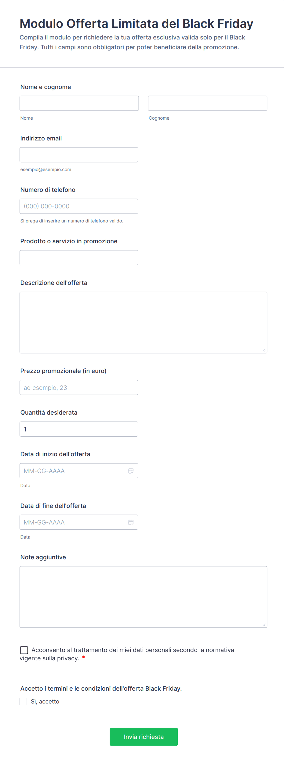 I modelli di moduli per il Black Friday sono progettati per aiutare aziende, rivenditori e organizzazioni a gestire efficacemente l'incremento di attività durante la stagione degli acquisti del Black Friday. Questi modelli possono essere utilizzati per una varietà di scopi, come raccogliere le registrazioni dei clienti per offerte esclusive, elaborare pre-ordini, gestire RSVP per eventi, raccogliere feedback sulle promozioni del Black Friday, o anche organizzare concorsi e omaggi a tempo limitato. Ottimizzando la raccolta dei dati e automatizzando i flussi di lavoro, i modelli di moduli per il Black Friday aiutano le aziende a gestire alti volumi di interazioni con i clienti, tenere traccia dell'inventario e garantire un'esperienza di acquisto fluida sia per i clienti che per il personale.
