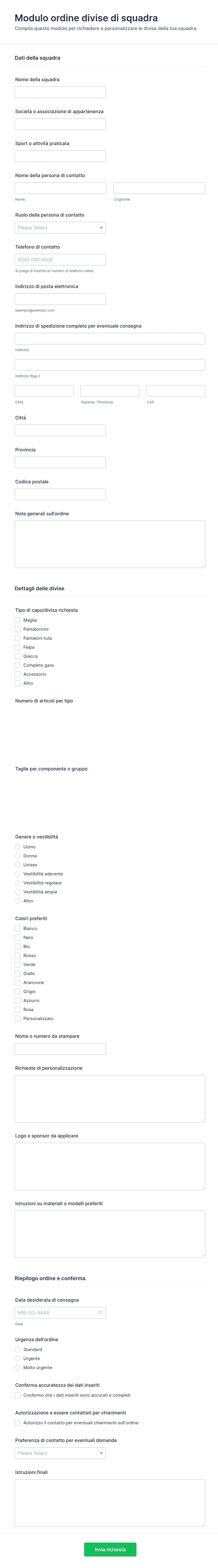 I campi comuni includono nome, dati di contatto, organizzazione o squadra, tipo di uniforme, taglia, quantità, opzioni di personalizzazione e informazioni di pagamento.