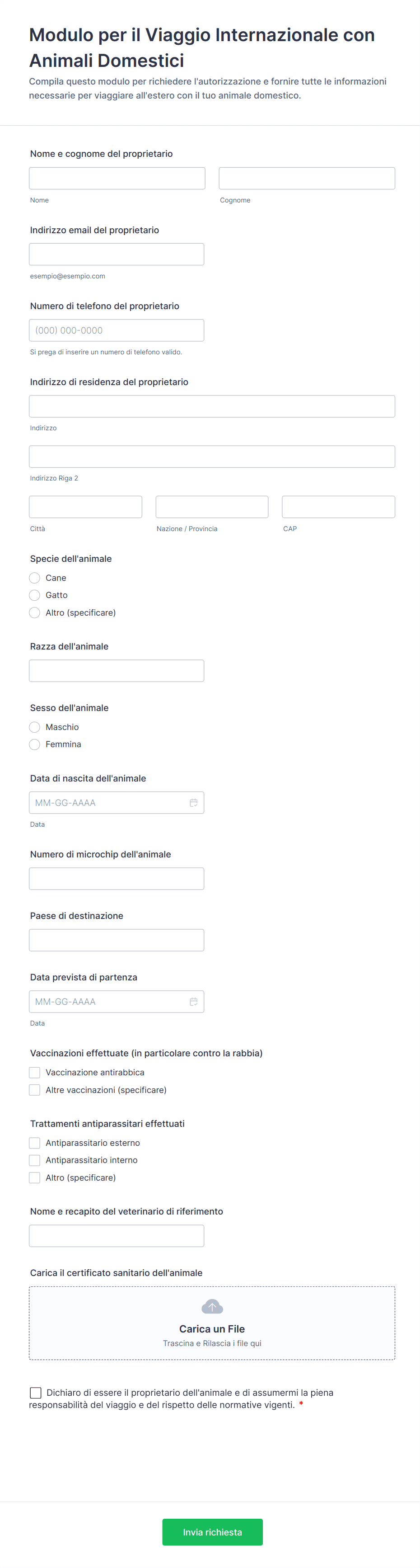 Raccogli in un unico posto le richieste di viaggio internazionale con animali domestici, organizzando dati del proprietario e dell’animale e la raccolta dati per la destinazione, con una modello di modulo personalizzabile su Jotform.