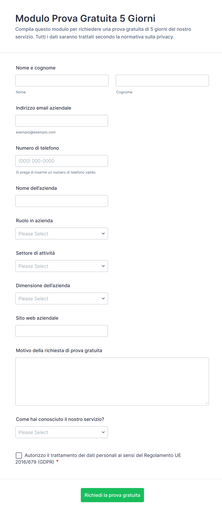- Moduli di contatto o di richiesta informazioni per le aziende che offrono servizi.