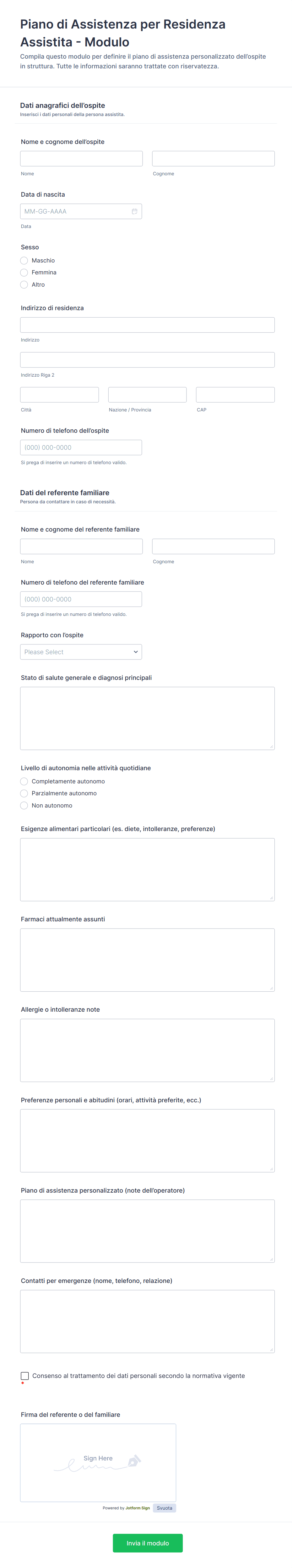 - I moduli di accettazione sanitaria possono richiedere campi per la storia clinica, le allergie e l'assicurazione.