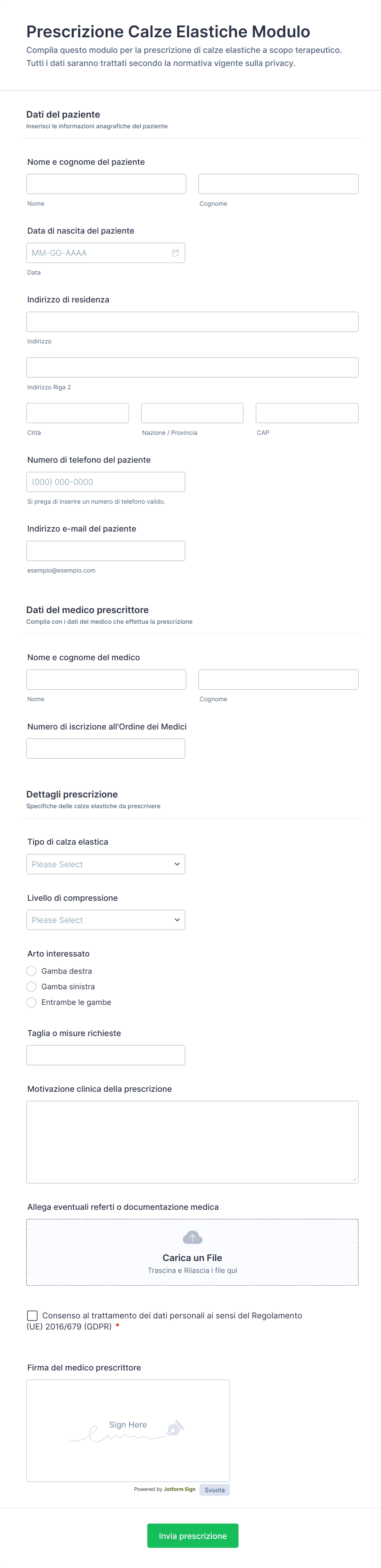 Inizia scegliendo uno dei nostri modelli sanitari o inizia a personalizzare il tuo. Inoltre, Jotform offre un modo semplice per aggiornare la storia medica, acquisire il consenso firme elettroniche, riscuotere pagamenti, trovare nuove opportunità di business e altro ancora. Jotform offre anche funzionalità di conformità HIPAA in modo che i tuoi moduli sanitari rimangano al sicuro.