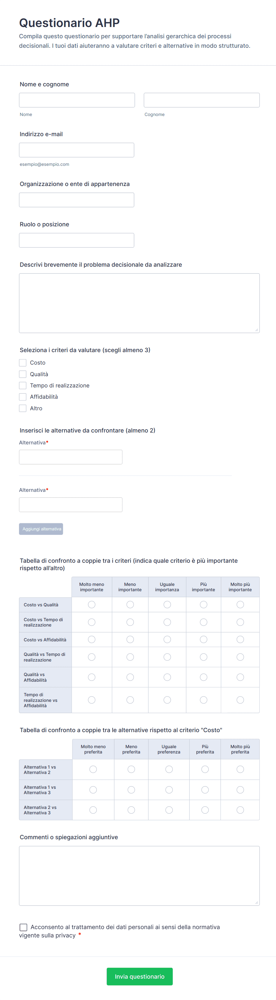 - La scelta dei tipi di domande (scelte multiple, scale di valutazione, testo aperto) varia a seconda del caso d'uso.