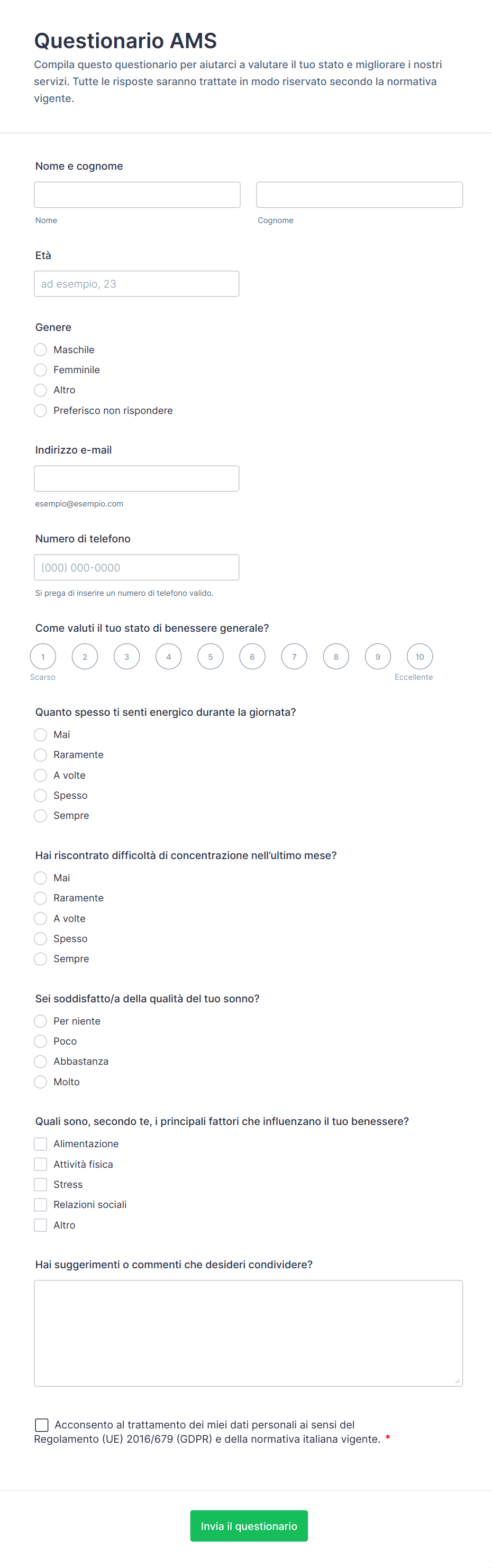 - Contenuti e campi differiscono in base all'obiettivo: ad esempio, un questionario di screening sanitario può includere la storia medica e liste di controllo dei sintomi, mentre un modulo di feedback del cliente si concentra su valutazioni di soddisfazione e commenti aperti.