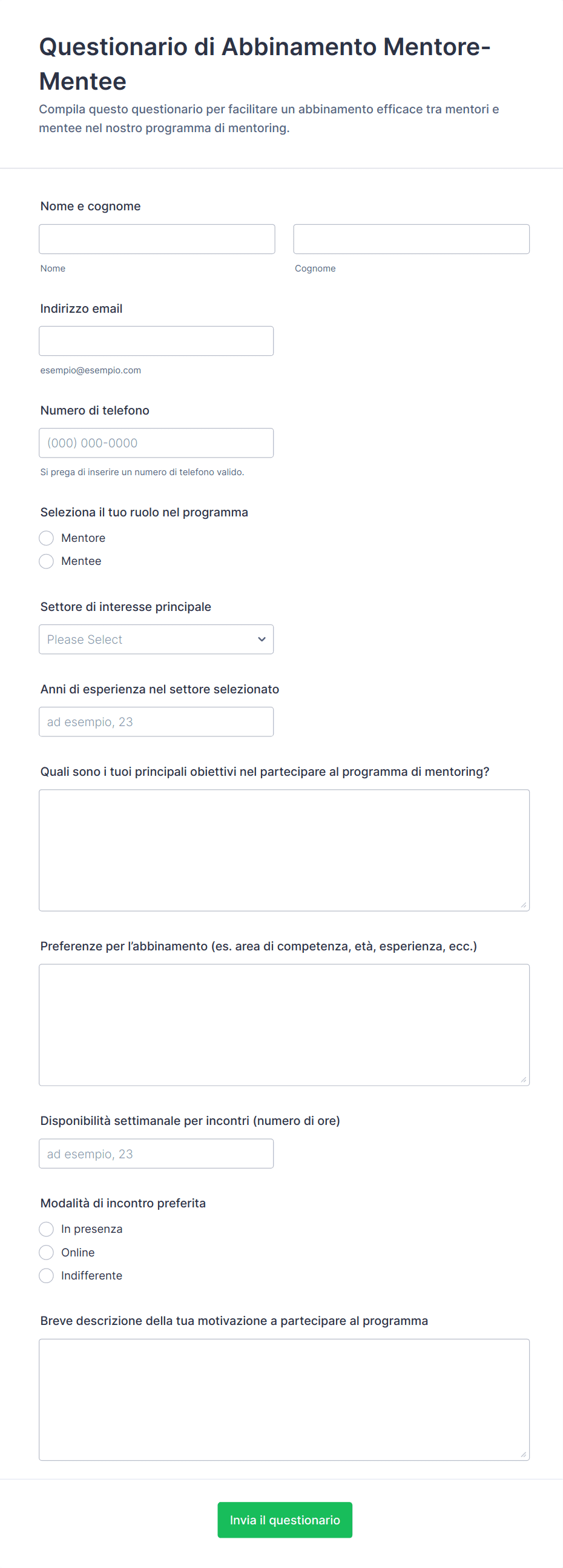 3. Quali informazioni sono tipicamente incluse in un modello di questionario?
