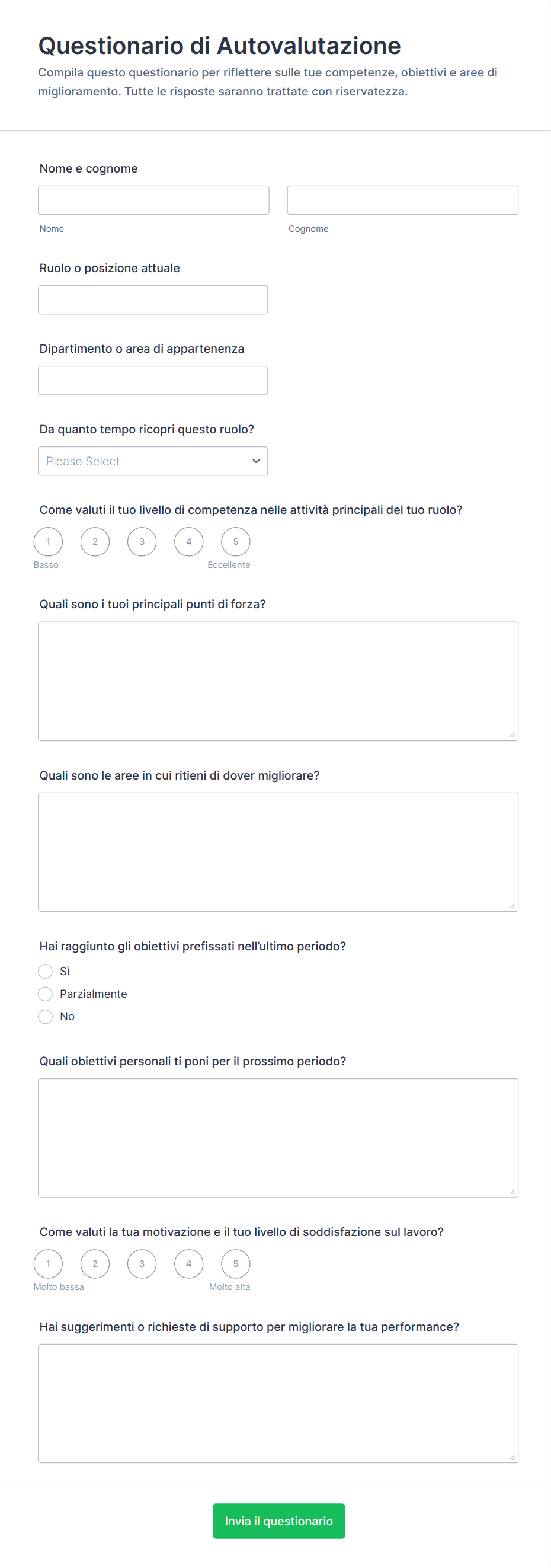 Raccogli autovalutazioni dei dipendenti con il Questionario di autovalutazione, ideale per colloqui periodici, piani di sviluppo e raccolta dati su competenze, motivazione e obiettivi in azienda.
