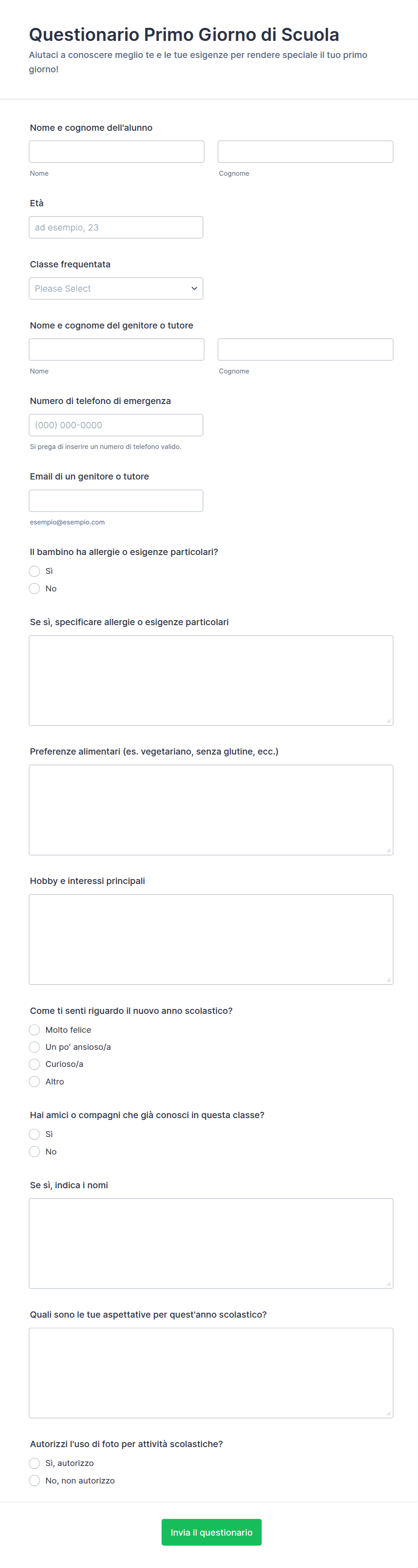 3. Quali informazioni sono tipicamente incluse in un modello di questionario?