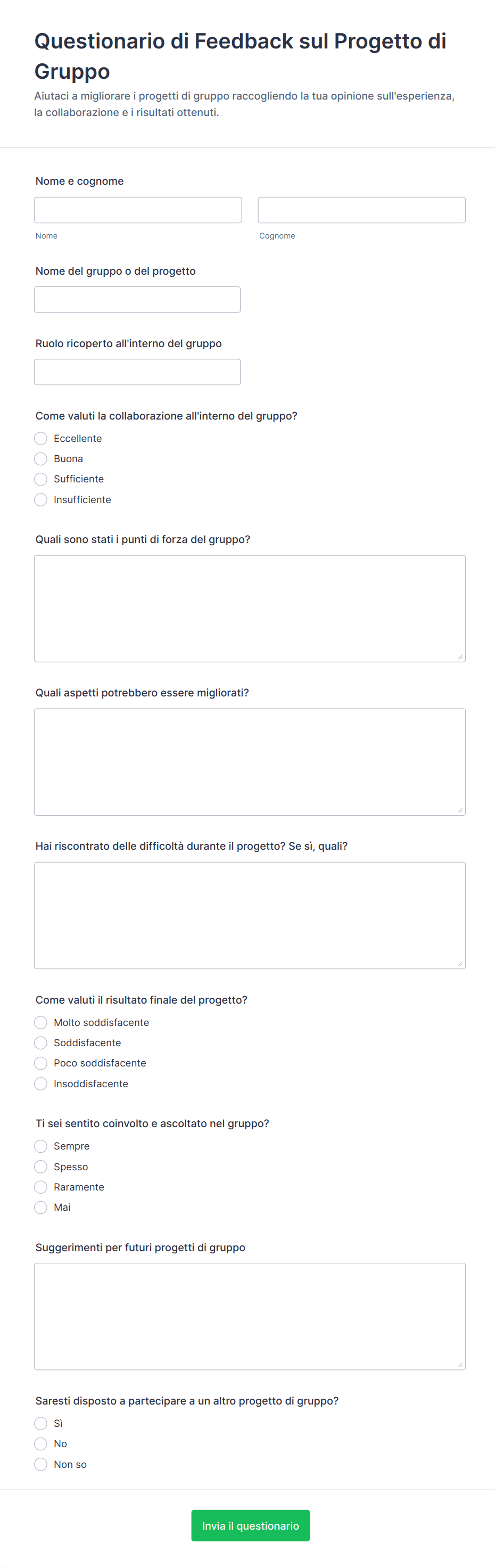 Un modello di questionario è un modulo già pronto, utilizzato per raccogliere informazioni strutturate dagli utenti per vari scopi, come ricerche, feedback o valutazioni.