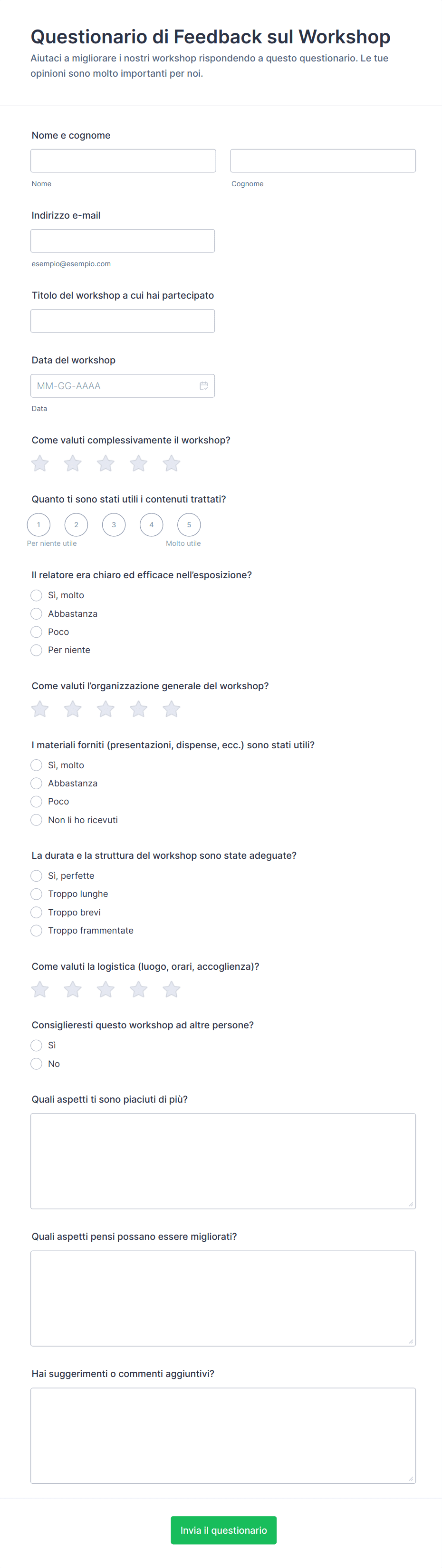 - Scale di valutazione (ad esempio, 1-5 stelle per sessioni, relatori o soddisfazione complessiva)