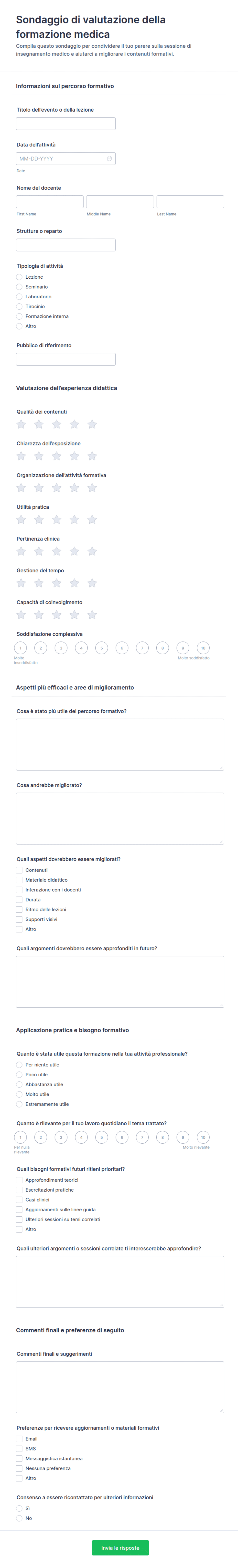 - Valutazione dei bisogni pre-formazione: Include domande demografiche, verifiche delle conoscenze di base e obiettivi di apprendimento.