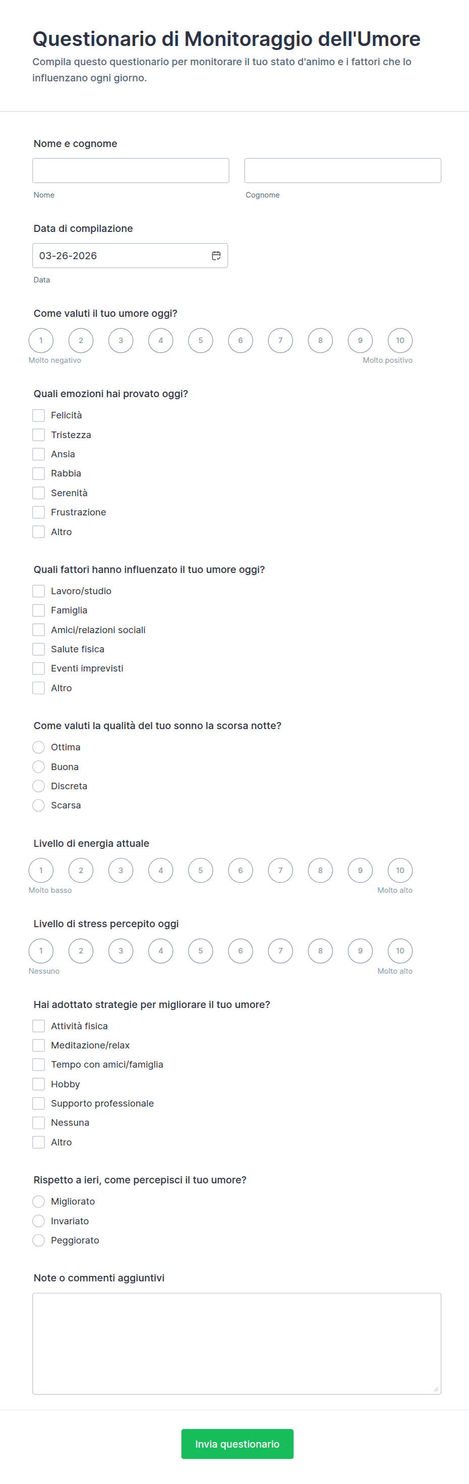 - Contenuti e campi differiscono in base all'obiettivo: ad esempio, un questionario di screening sanitario può includere la storia medica e liste di controllo dei sintomi, mentre un modulo di feedback del cliente si concentra su valutazioni di soddisfazione e commenti aperti.