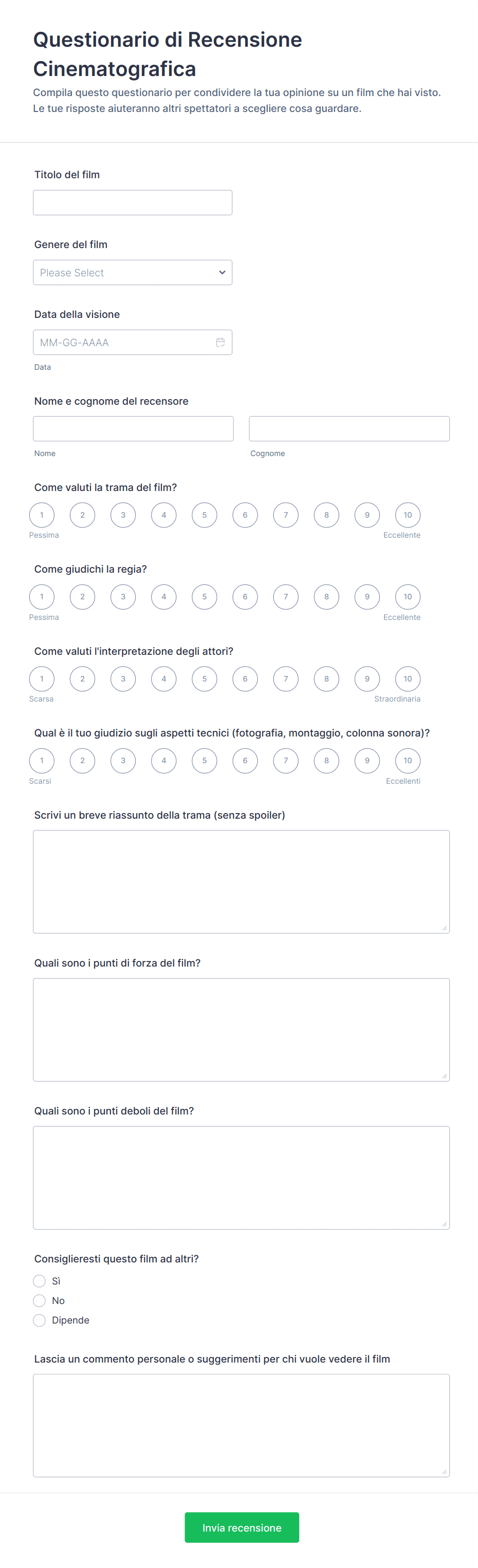 Un modello di questionario è un modulo già pronto, utilizzato per raccogliere informazioni strutturate dagli utenti per vari scopi, come ricerche, feedback o valutazioni.