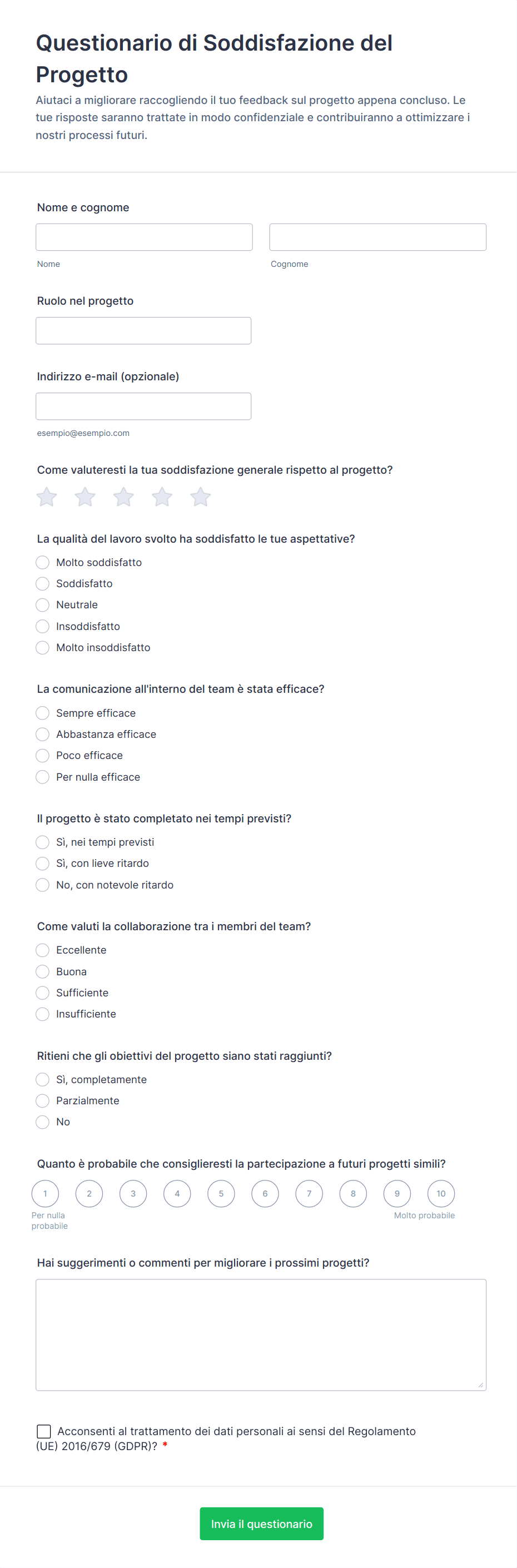 - La scelta dei tipi di domande (scelte multiple, scale di valutazione, testo aperto) varia a seconda del caso d'uso.