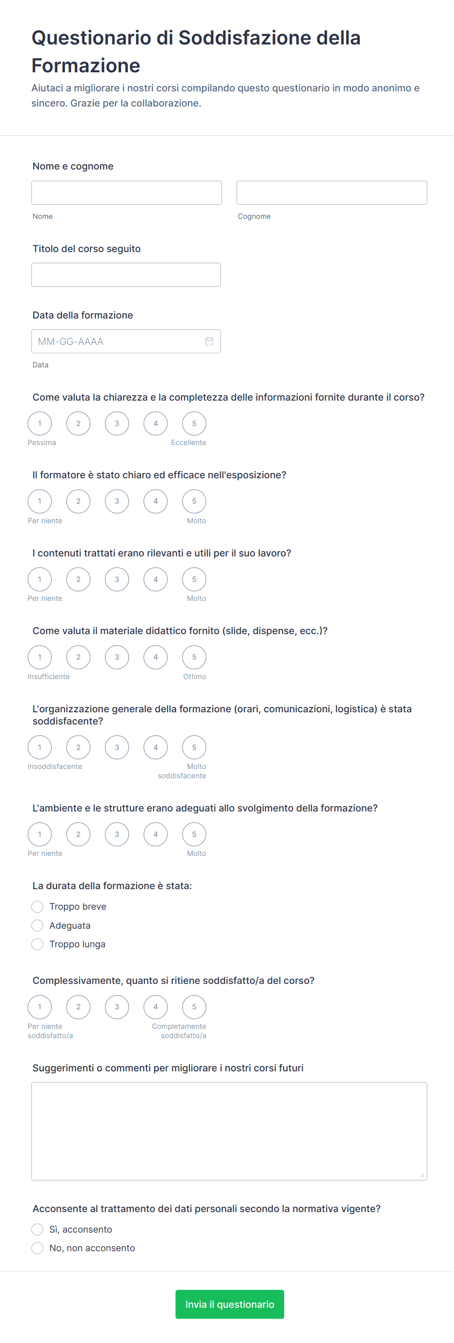 Collect training name, session date, trainer name, department, and participant role so results can be segmented.