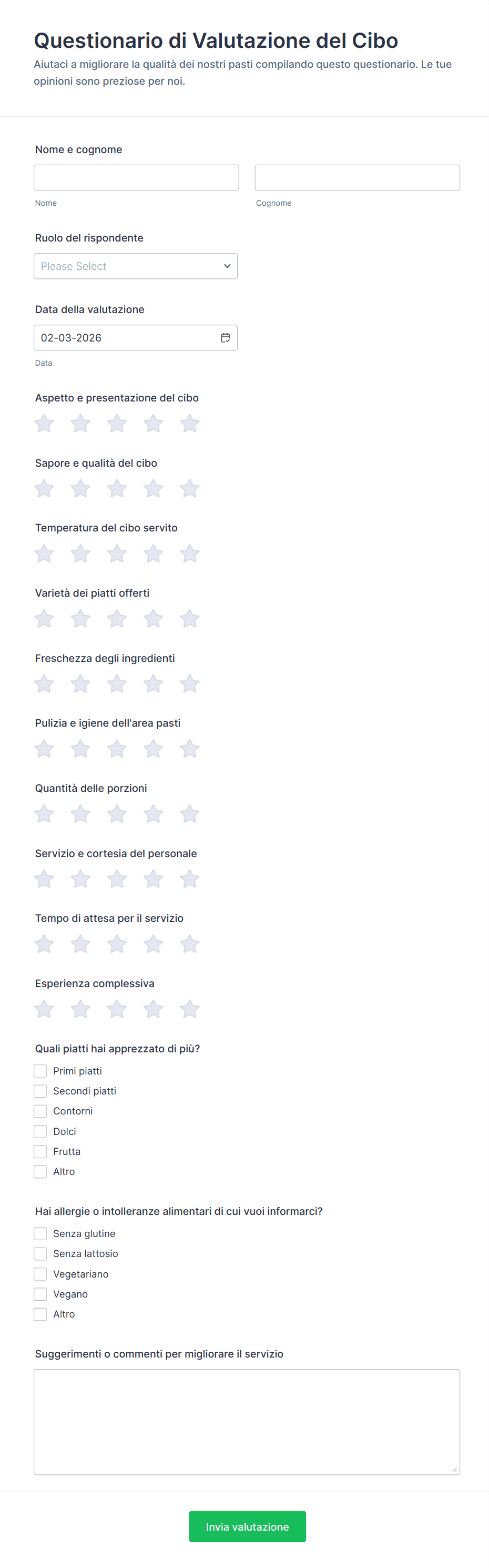 Un modulo di valutazione del ristorante è un questionario strutturato utilizzato per valutare vari aspetti delle operazioni di un ristorante, inclusi la qualità del cibo, il servizio, la pulizia e l'esperienza complessiva del cliente.