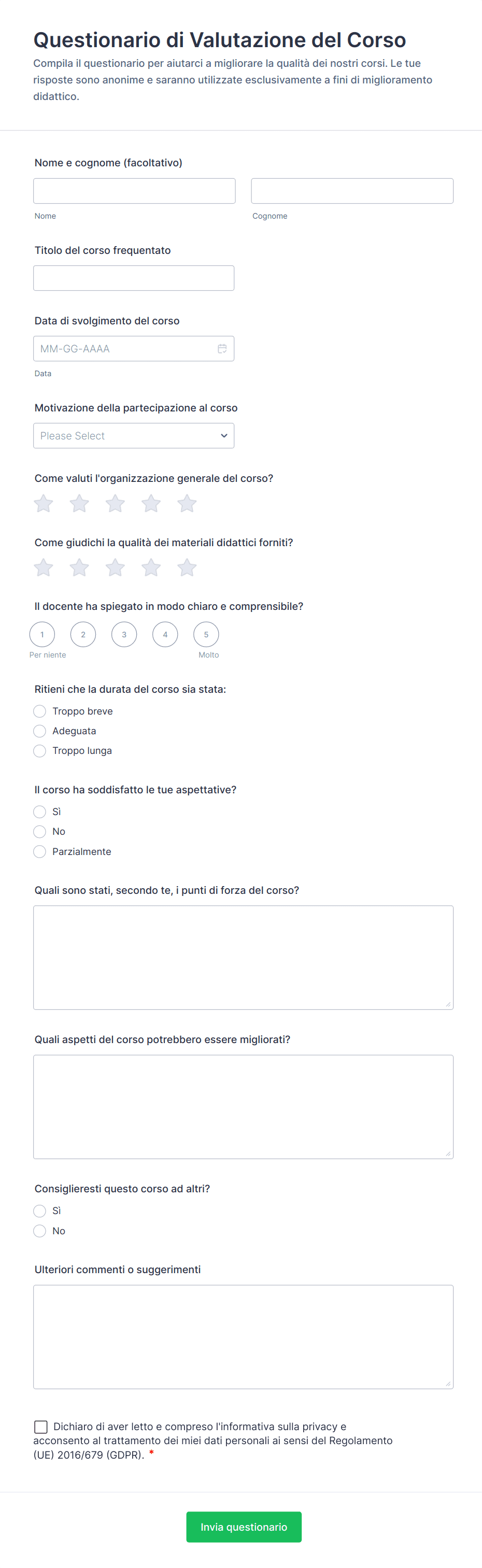 Seguendo questi passaggi, puoi creare un Modulo di Valutazione del Corso su misura che cattura il feedback necessario per migliorare le tue offerte educative e garantire un miglioramento continuo.