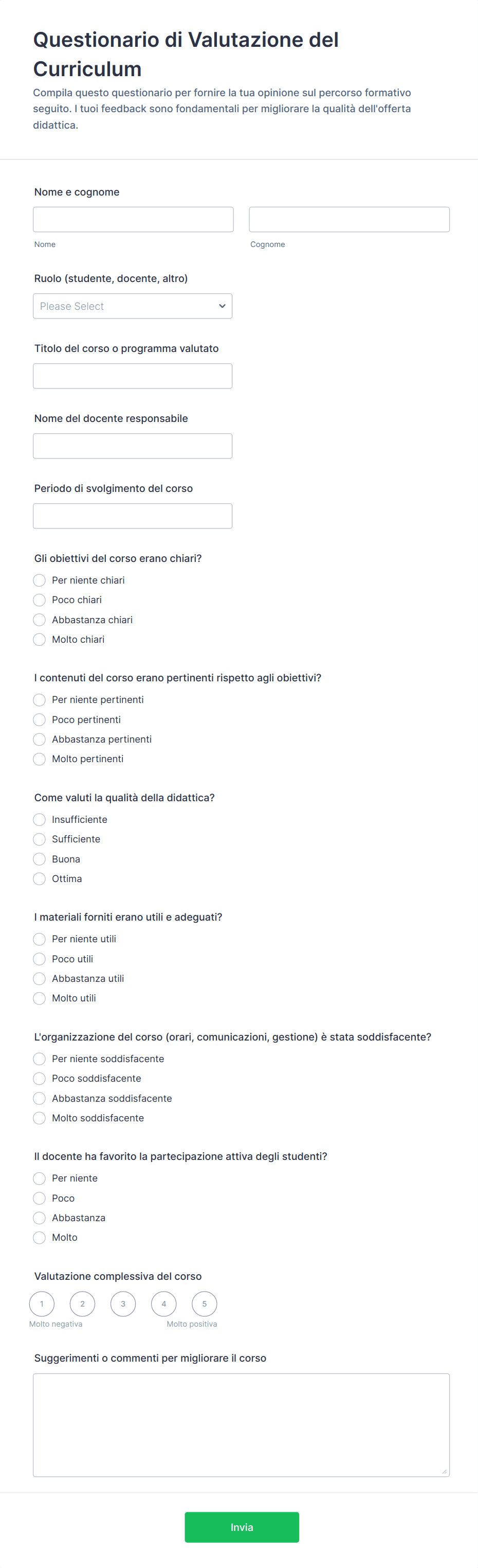• La scelta dei tipi di domande (scelte multiple, scale di valutazione, testo aperto) varia a seconda del caso d'uso.