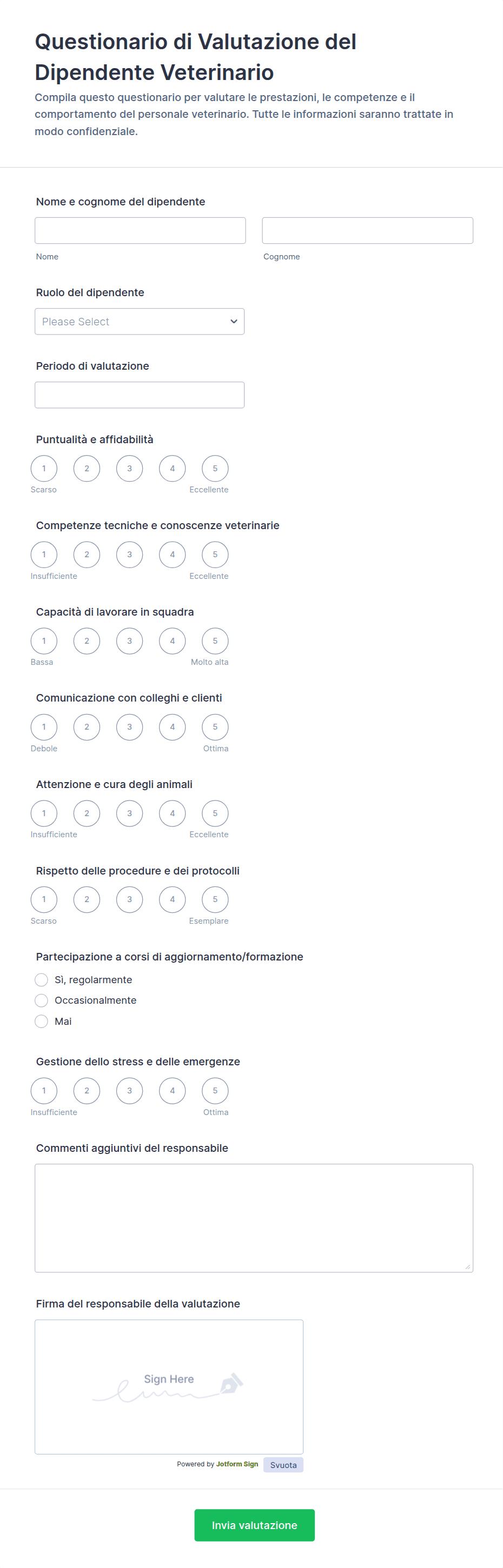 Un modulo di valutazione dei dipendenti è uno strumento di revisione delle prestazioni utilizzato per tenere traccia dei progressi dei dipendenti raccogliendo informazioni sulle competenze, sugli obiettivi e sui risultati dei dipendenti. Con i nostri modelli gratuiti di moduli di valutazione dei dipendenti, puoi raccogliere risposte online per vedere facilmente cosa stanno facendo i tuoi dipendenti e identificare le aree di miglioramento. Dopo aver condotto le valutazioni dei dipendenti tramite il tuo computer o dispositivo mobile, queste verranno archiviate in modo sicuro nel tuo account Jotform, semplificando la gestione delle recensioni e la conversione in PDF stampabili!