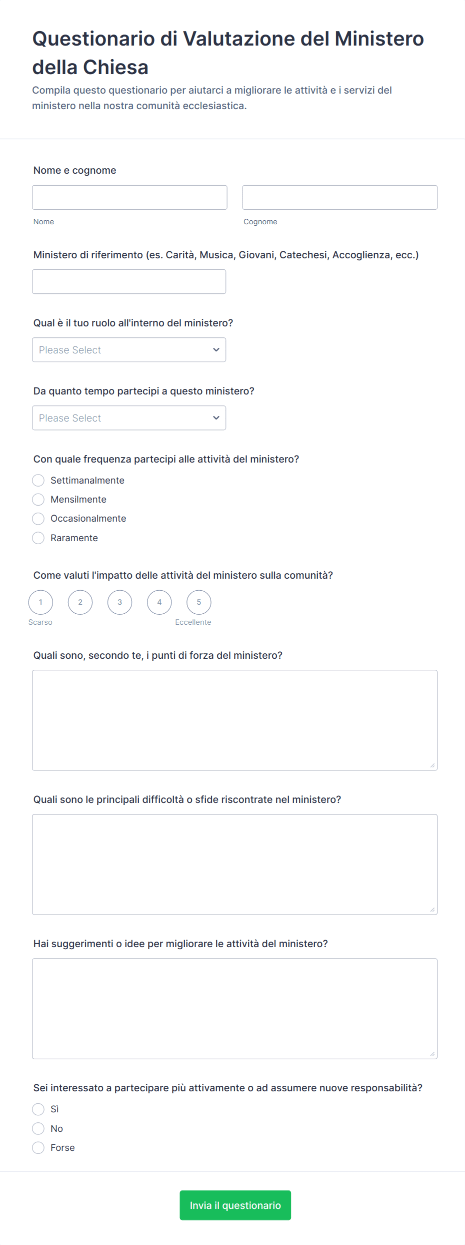 Un modello di modulo per le chiese è un modulo online già pronto, che aiuta le chiese a raccogliere e gestire informazioni per varie attività, come registrazioni agli eventi, donazioni, iscrizioni di volontari e richieste di preghiere.