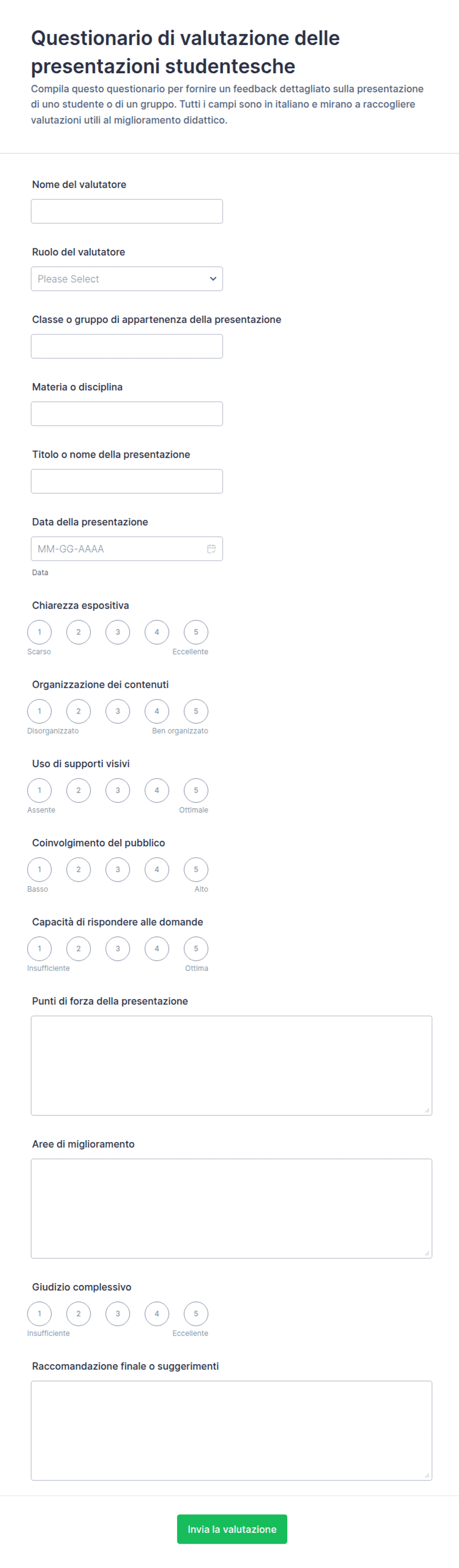Raccogli feedback su docenti e corsi con il Questionario di valutazione docente Form, ideale per scuole ed enti di formazione che vogliono migliorare la qualità delle lezioni con Jotform e la data collection online.
