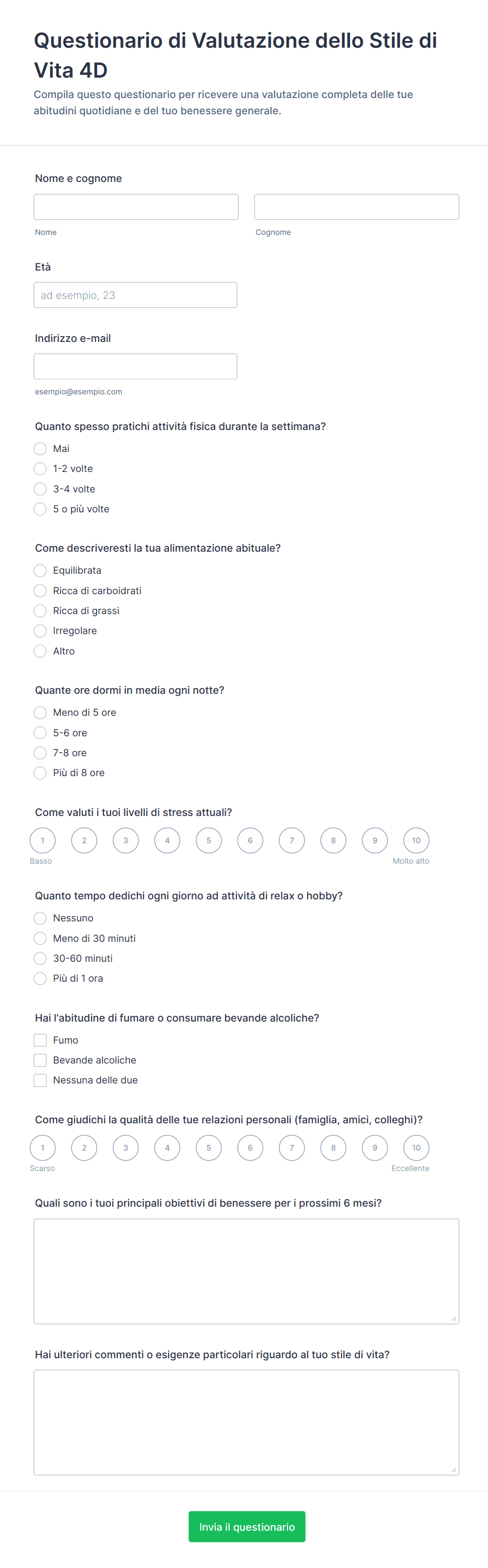 - Contenuti e campi differiscono in base all'obiettivo: ad esempio, un questionario di screening sanitario può includere la storia medica e liste di controllo dei sintomi, mentre un modulo di feedback del cliente si concentra su valutazioni di soddisfazione e commenti aperti.