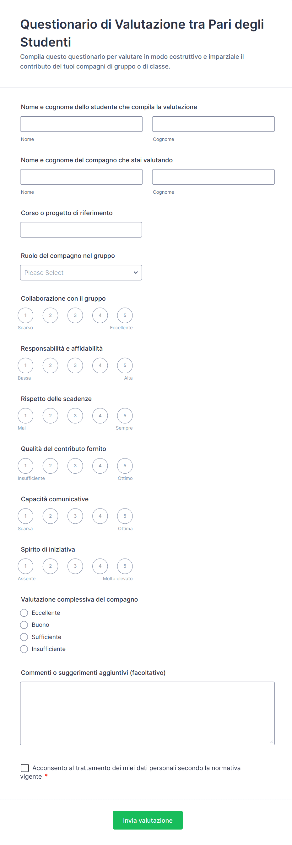 Un modulo di valutazione tra pari è un questionario strutturato utilizzato per raccogliere feedback da individui sui loro colleghi, compagni di classe o membri del team, focalizzandosi tipicamente su prestazioni, partecipazione e collaborazione.