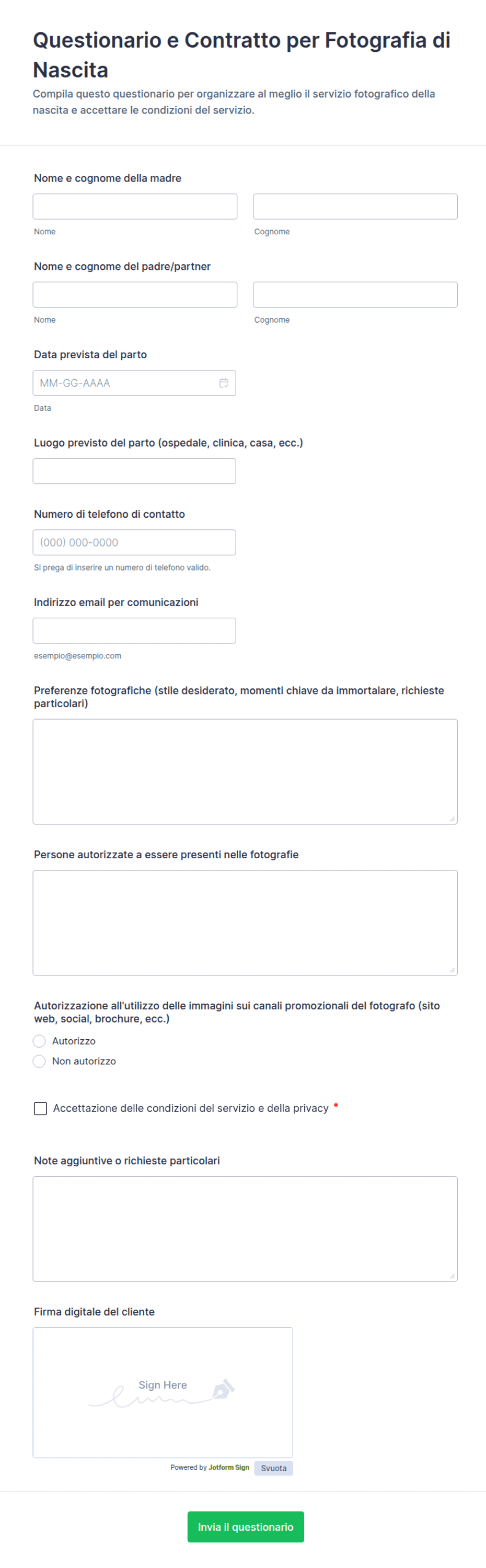 Un modello di modulo fotografico è un modulo online già pronto, che aiuta i fotografi a raccogliere informazioni per prenotazioni, liberatorie, ordini, feedback e altro, semplificando le attività amministrative.