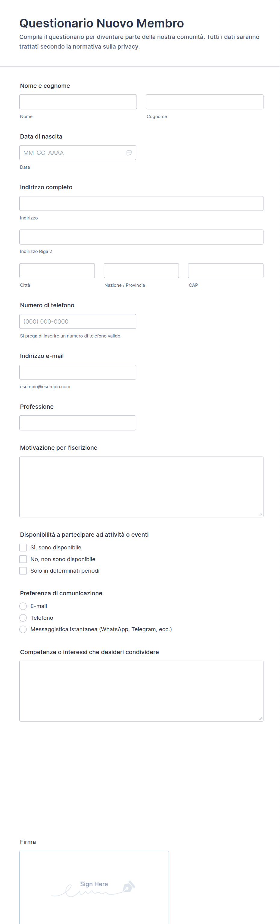 Sì, i moduli possono essere personalizzati per varie organizzazioni come club sportivi, associazioni professionali, enti non profit, comunità online e altro ancora. Ogni tipo potrebbe richiedere campi e informazioni diverse.