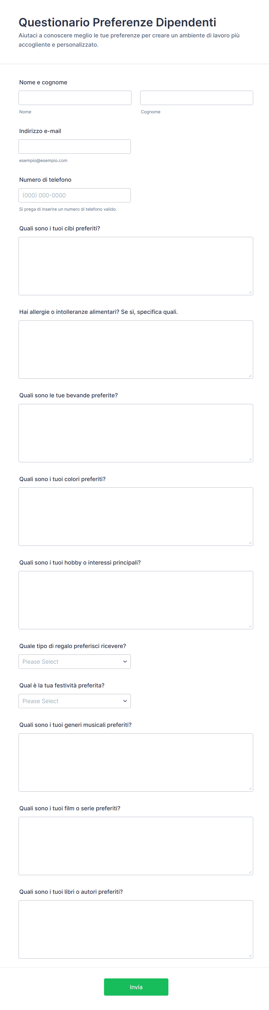 - Valutazioni delle prestazioni: Possono richiedere scale di valutazione, feedback aperto e campi di autovalutazione.