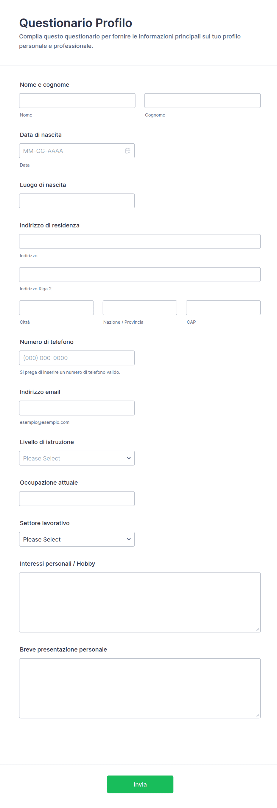 3. Quali informazioni sono tipicamente incluse in un modello di questionario?