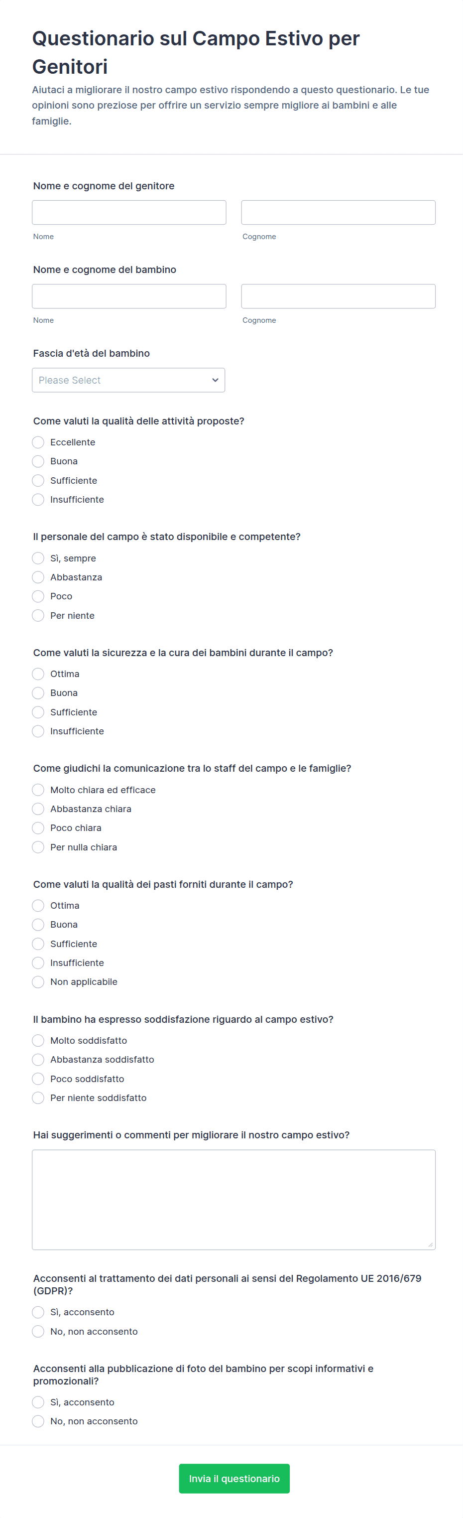 - Per i sondaggi rivolti a genitori o personale, includi domande più dettagliate e campi aperti per un feedback completo.