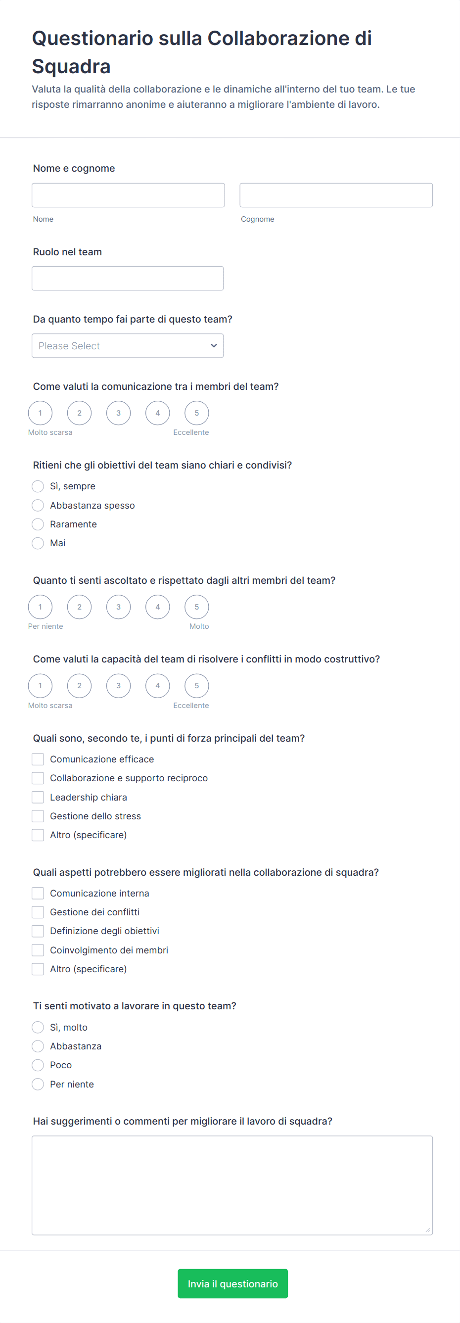 - Valutazioni delle prestazioni: Possono richiedere scale di valutazione, feedback aperto e campi di autovalutazione.